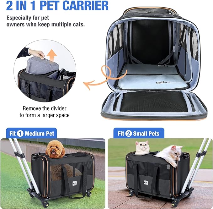 • 2-in-1 Pet Carrier: Easily switch between double-compartment and single-compartment design by removing the divider to accommodate one small to medium sized dog up to 35lbs or 2 small 17lbs cats. The dog cat carrier with wheels is versatile and convenient for different travel needs.