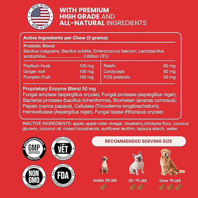 • Immune & Allergy Support - Our Aller-Elite Probiotic Chews are infused with immune-enhancing ingredients like Reishi and Cordyceps mushrooms, that support the immune system to help manage seasonal allergy symptoms, fight yeast and provide your dog with comprehensive health benefits.