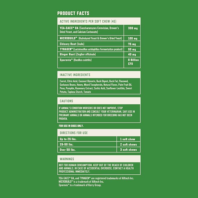 • Unparalleled Support – Our delicious duck-flavored soft chews provide unparalleled support for your dog’s digestive system and overall gut health. We combined pre-, pro-, and postbiotics at high levels of concentration and purity, because your pet deserves the best. These chews provide maximum support to your dog’s existing gut microbiome and introduce new probiotics to help promote gut health from every angle.
