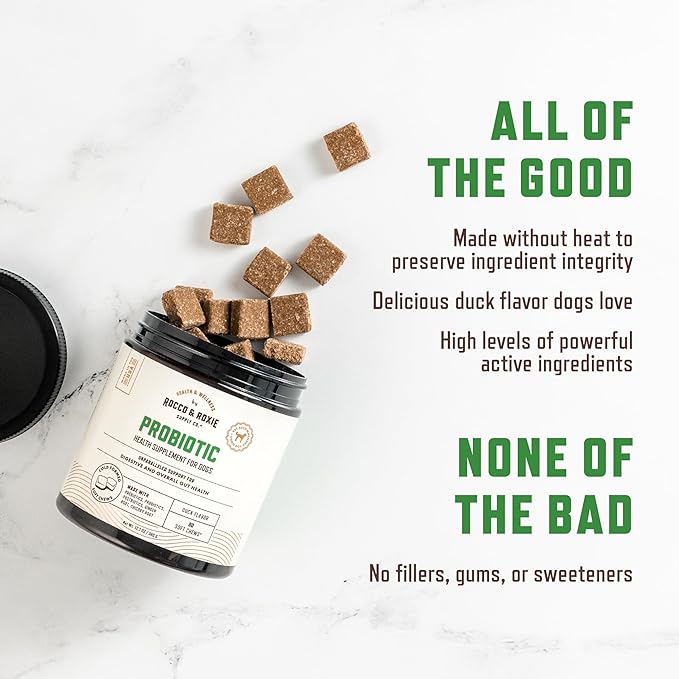 Rocco & Roxie Probiotics for Dogs, Support Gut and Digestive Health, Anti Diarrhea, Constipation & Gas Relief, Allergies, & Itchy Skin, Prebiotics, Enzymes, Puppy to Senior Dog Supplements Chews 90ct