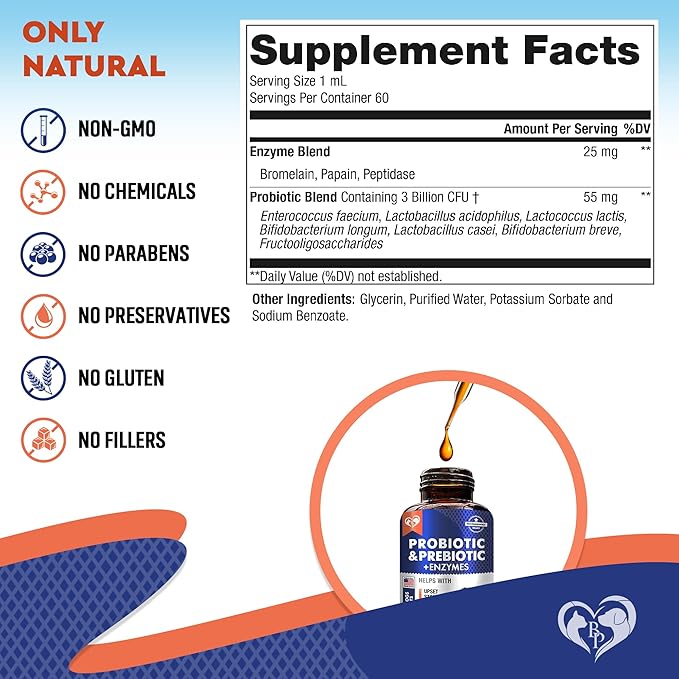 • ✅HOLISTIC DOG & CAT PROBIOTICS blend enriched with enzymes and prebiotics, is meticulously formulated to promote comprehensive gastrointestinal health and can be an excellent replacement for pills and probiotic & prebiotic treats. This liquid supplement not only do its alleviate itching and support tummy comfort, but it also ensure healthy poop consistency, addressing multiple facets of your pet's digestive well-being.