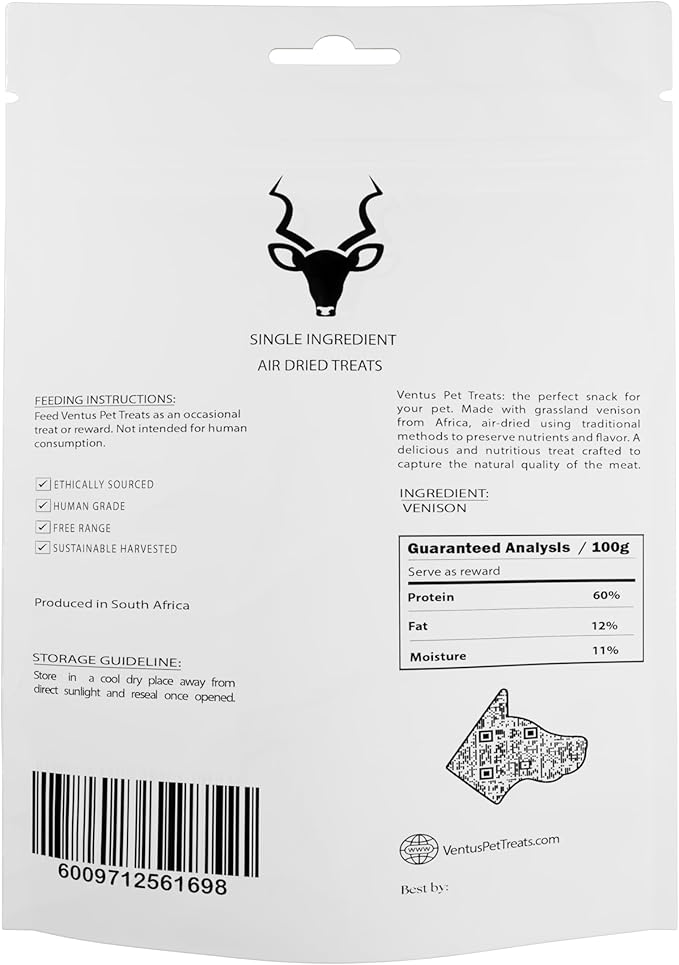 • MADE WITH ONE INGREDIENT: Each pack of Ventus Pet Treats are made from 100% whole-muscle sustainably sourced grassland venison and naturally free from any artificial ingredients