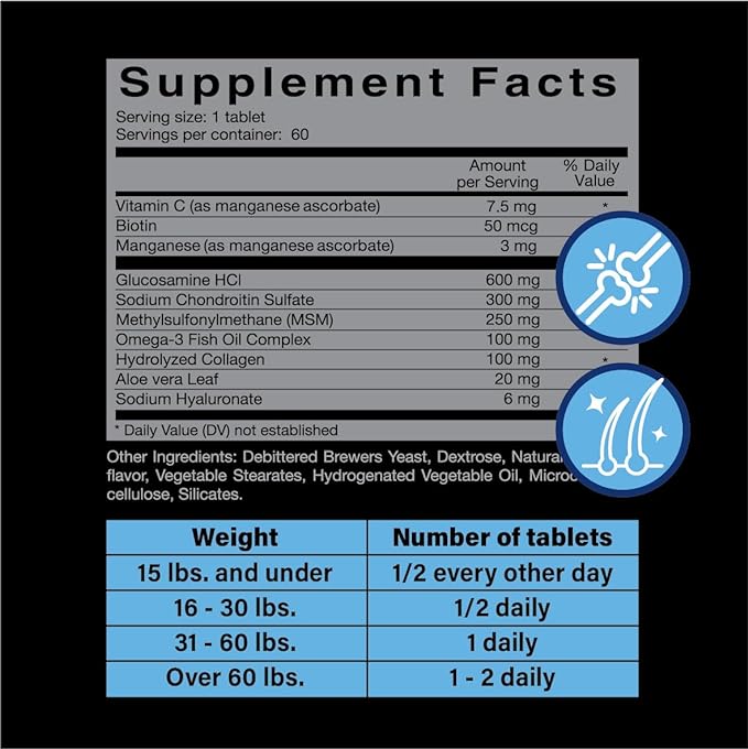 • Nourish Skin & Coat Health: Each chewable tablet contains Omega 3, Collagen & Biotin to help nourish the skin for a healthy shiny coat. Our joint supplement for dogs helps promote hair growth, reduce excessive shedding while preventing dry and itchy skin