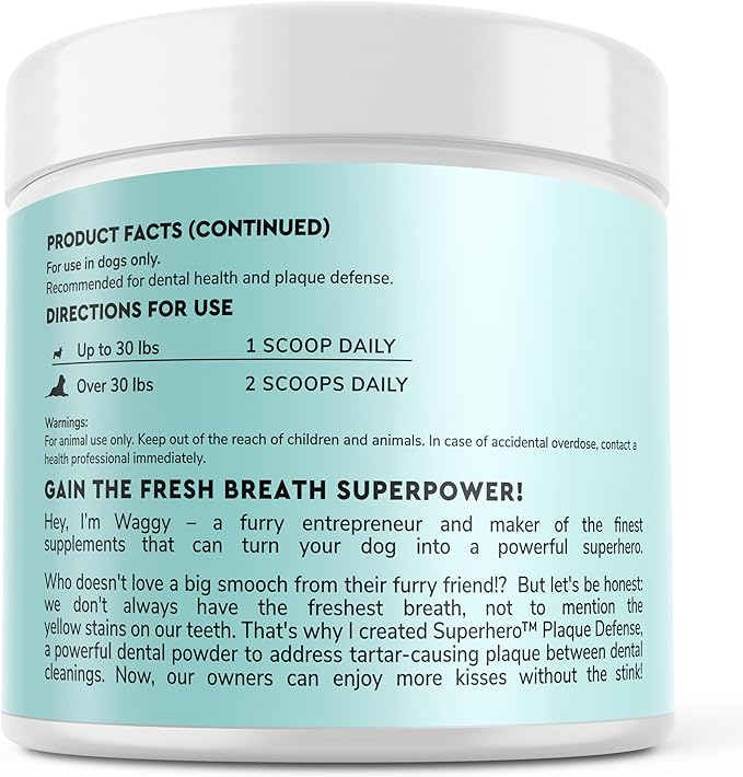 • EASY TO USE: For dogs of all breeds, ages, and sizes! Just sprinkle one scoop in your pet’s food for dogs up to 30 pounds and 2 scoops for dogs over 30 pounds. Plaque can cause bad breath and leave pets’teeth stained and yellow. Our plaque & tarter remover for dogs helps support gum health, teeth, fresh odor and a healthy mouth. Give your pet delicious oral health today!