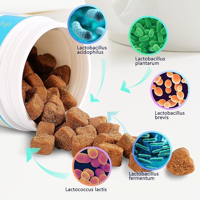 • 5- Strain Probiotic Blend - This Dog Probiotics chews functional supplement contains Lactobacillus acidophilus, Lactobacillus plantarum, Lactobacillus brevis, Lactobacillus fermentum, Lactococcus lactis supports proper digestive function, and the immune system.