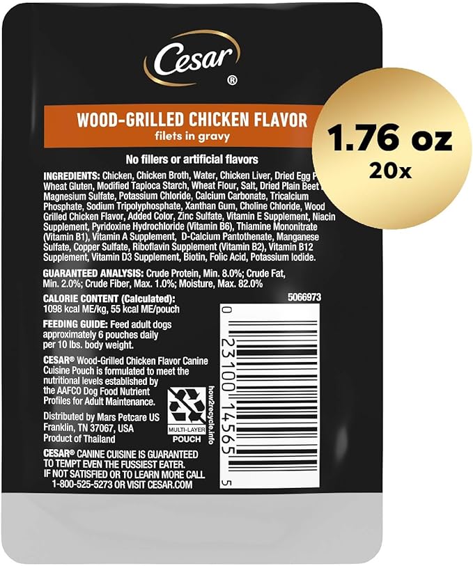 • 20-Pack: Contains twenty (20) 1.76 oz. Mini-Pouches of CESAR Filets in Gravy Wet Dog Food Wood-Grilled Chicken Flavor