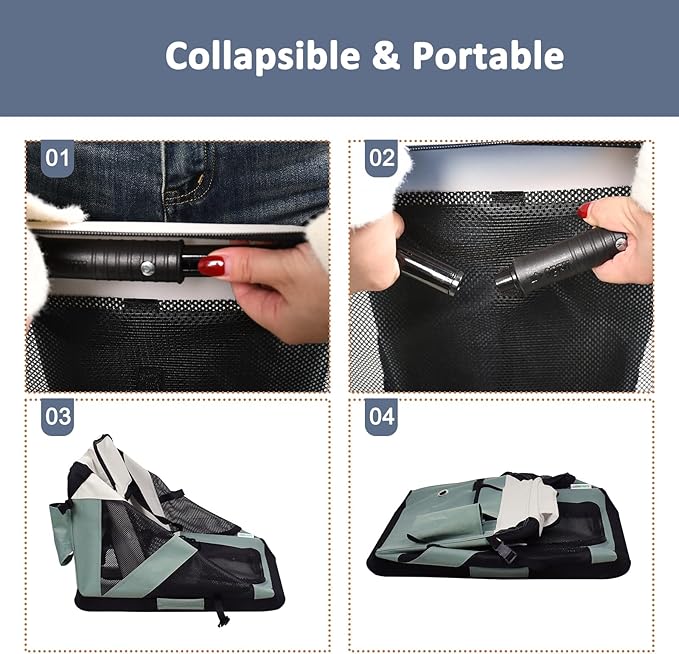 • Collapsible Dog Kennel: Three mesh entrances door (Top, front and side) for convenience sunlight and breathability; Ample Ventilation for Use in All Season. Easy carry with handle or strap. Adjustable strap included.