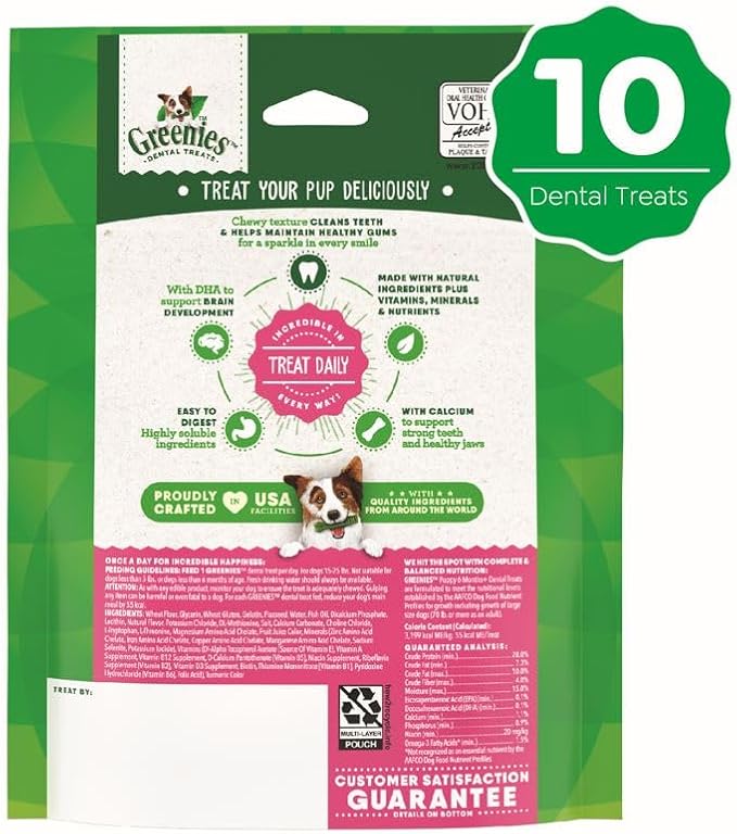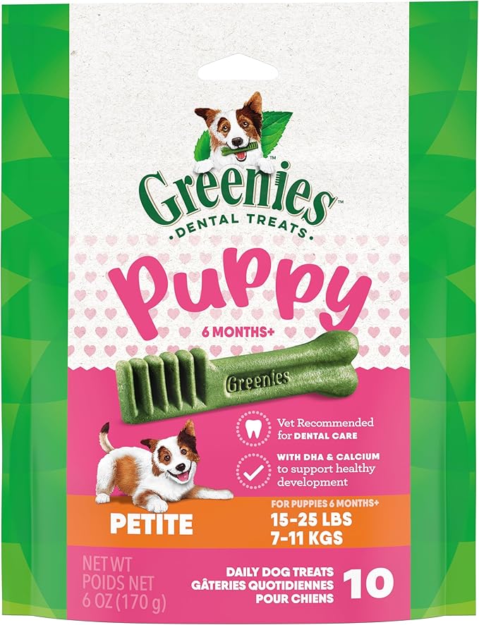 • Contains one (1) 6 oz., 10-count pack of GREENIES Puppy Petite Size Natural Dental Dog Treats