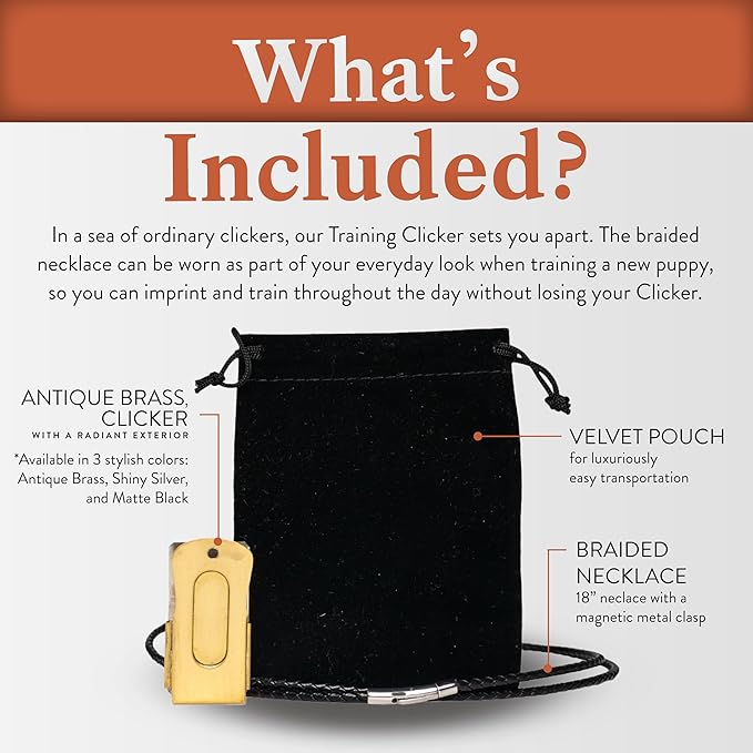 • Stand Out with Class: In a sea of ordinary clickers, our elegant Gold Puppy Training Clicker sets you apart. Embrace sophistication and style while improving your dog agility. Our dog accessories clicker product has a black exterior and also features a braided leather necklace with a magnetic metal clasp that matches your style perfectly
