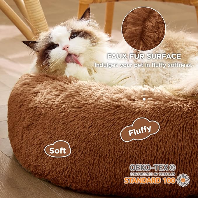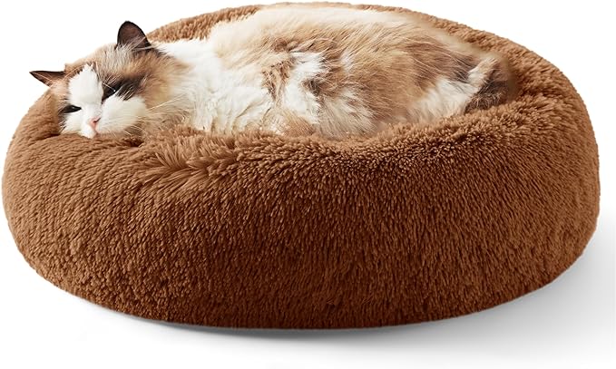 Bedsure Calming Cat Beds for Indoor Cats - Small Cat Bed Washable 20 inches, Anti-Slip Round Fluffy Plush Faux Fur Pet Bed, Fits up to 15 lbs Pets, Caramel