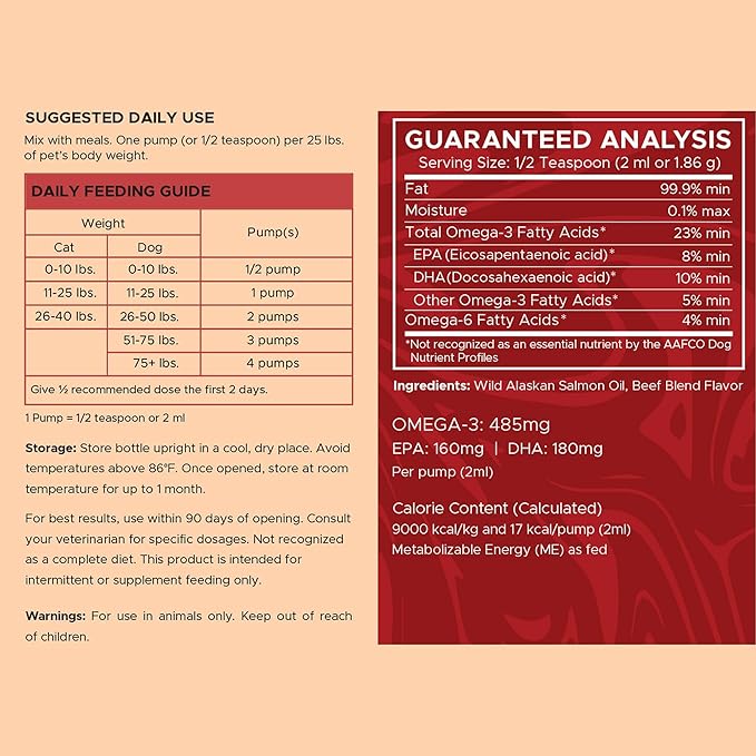 • Made in America: This Beef Flavored Wild Alaskan Salmon Oil is designed for dogs. The delicious and nutritious beef flavor will entice even the pickiest of felines! Recommended dosage varies by animal size, consult the package.