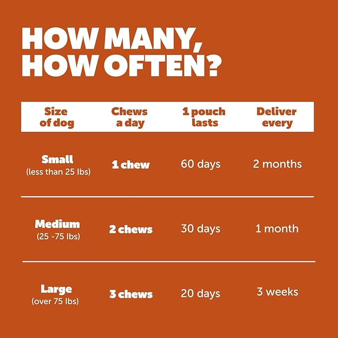 • Suitable for dogs of all sizes: 60 chews per pack. The bigger your dog, the more chews they need. See below for how many chews your dog needs each day.