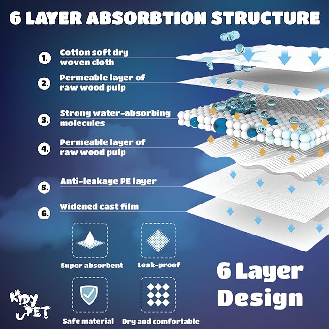 • Super Absorbent: Our 6-layer pee pads for dogs boast superior absorbency, especially in comparison to other pads.