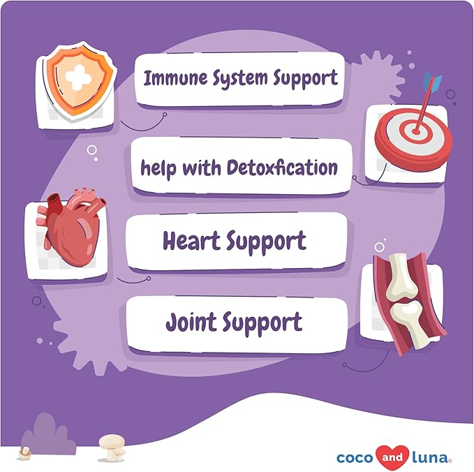 • Digestive Health - Coco and Luna Mushroom Complex contains mushrooms such as Turkey Tail, Lion’s Mane and Shiitake Mushroom which may provide your dog digestive support.