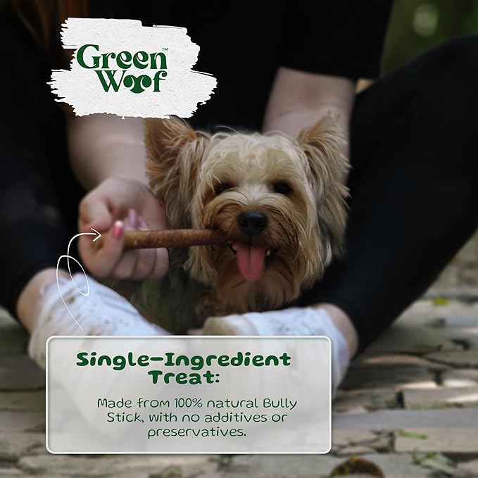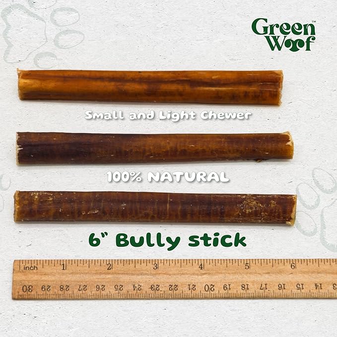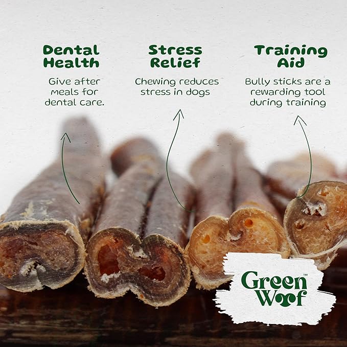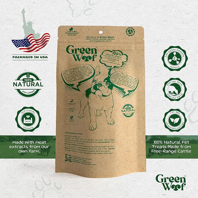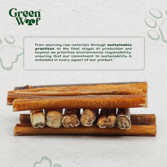 • Eco-Friendly & Sustainably Sourced: Our bully sticks, part of the Green Woof collection, are crafted with the planet's health in mind. Made from 100% natural beef pizzle, these treats are sourced from grass-fed cattle raised on sustainable pastures. This approach ensures a minimal carbon footprint while providing high-quality chews for your pet.