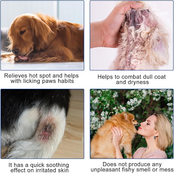 • 🐕🐶 Promotes Skin & Coat Health - Our omega-3 tablets provides support for dry, flaky skin in allergy pets. Omega-3 fish oil may also leads to reduced itchiness and help reduce skin irritation such as hot spots and dermatitis.