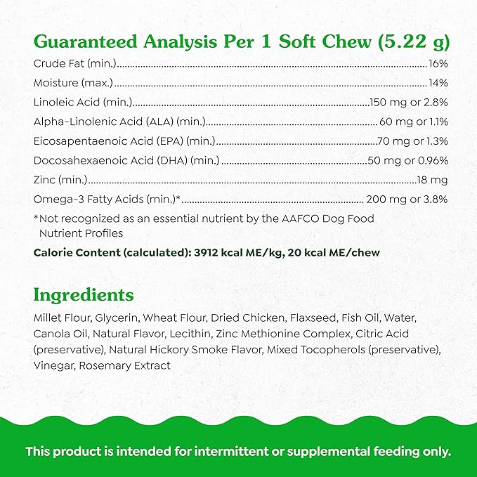 • Contains: One (1) 80-count pack of GREENIES Skin & Coat Food Supplement Soft Chews, Chicken Flavor, 14.7 oz.; may take 6 weeks to see results