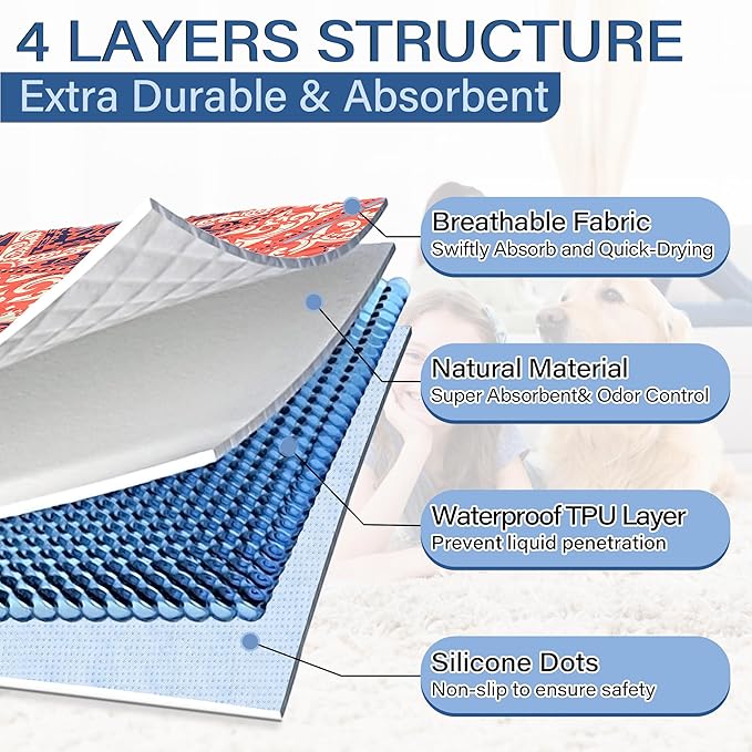 • 🐕Leak-proof Urine & Waterproof: Our washable dog pee pads feature a soft fabric that absorbs a significant amount of urine efficiently, meanwhile prevent odors and maintain a fresh-smelling in home. The high-quality waterproof TPU material guarantees urine not penetrate beyond the washable puppy pads, providing peace of mind and protecting your wood floors and carpets from accidents and mess. The reusable pee pads have exquisite patterns to add stylishly while protecting floors and furniture.
