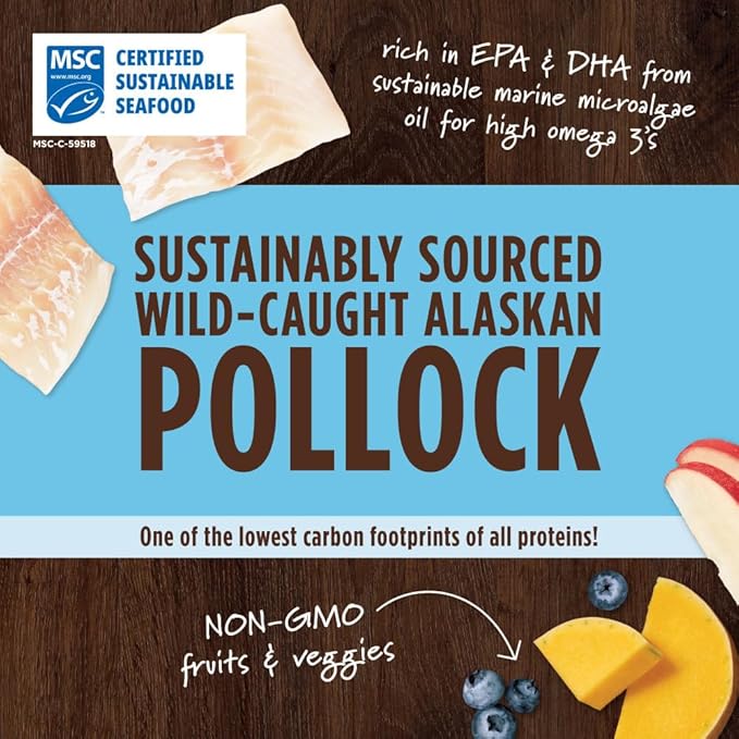 • Made with 25-ounces of MSC-Certified, wild-caught alaskan pollock plus non-GMO vegetables & fruits