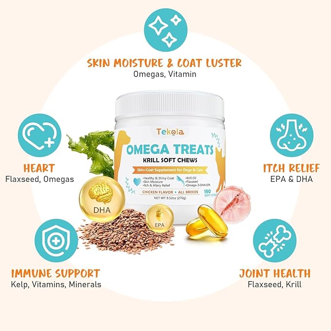 180 Chews Omega 3 for Dogs & Cats - with Krill - Skin and Coat Supplement - Dry & Itchy Skin Relief - Allergy Relief - Shiny Coats - No Shedding - EPA & DHA, Vitamins and Minerals - Chicken Flavor