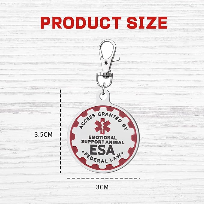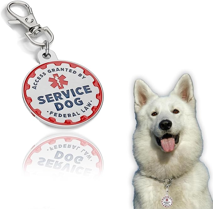 • 1. **High Visibility for Quick Identification:** Our service dog tag features a highly visible medical alert symbol and lettering that quickly identifies your working emotional support animal, therapy animal, or service dog. Enhance confidence while traveling and minimize questioning with this bright and easily recognizable Service Dog tag.