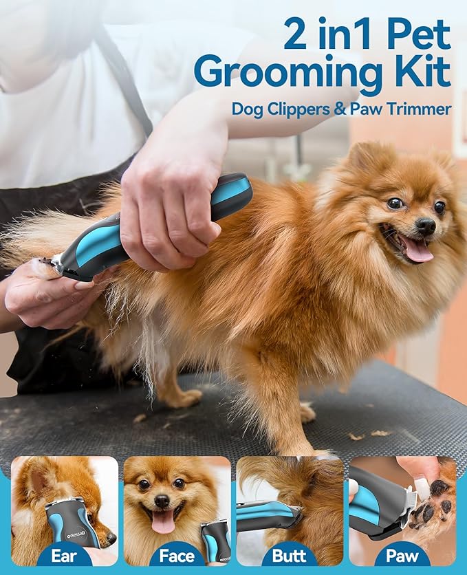 • 🐶【 2 in 1 Dog Clippers & Paw Trimmer Double Blades 】 oneisall dog grooming kit with double blades: Wide blade used for cutting thick coats, and the Narrow blade professional trimming your baby paw, face, buttocks, ears and other sensitive areas.