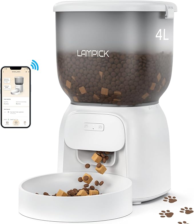 • 【4L Standard Capacity & Clog-fre e】This WiFi automatic cat feeder can store up to 16.9 cups dry food (1 cup = 48 Tsp) to feed cats and small dogs for 20 days. The smart cat feeder food outlet adopts a 45-degree steep slope design to make your cat's eating posture more comfortable and prevent clogging. Easily keep your cat or dog fed during long weekends and short business trips.