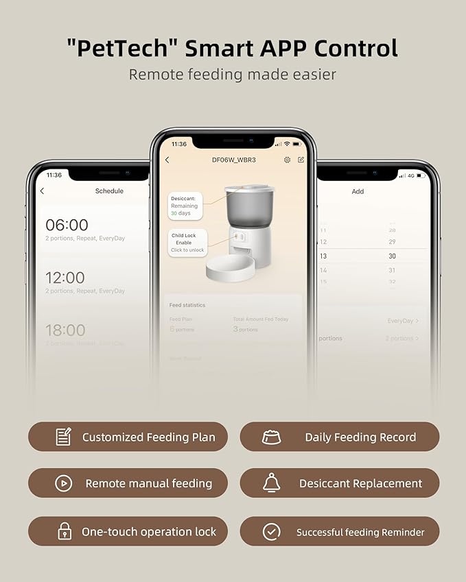• 【Smart App & 2.4 Ghz WiFi Connection】Once the LAMPICK WiFi automatic cat feeder is connected to the WiFi (Only supports 2.4GHz WiFi networks), you can easily set up or customize the feeding schedule remotely with the "PetTech" mobile APP, much more convenient than using the push button model. You can feed your pets anytime, anywhere on your smartphone and view the feeding log on App to make sure the cat food dispenser is working as scheduled. More convenience for you and your pet