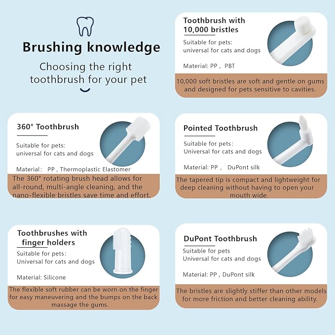 • BETTER ORAL CARE: Ensure your pet's dental health with our comprehensive cat toothbrush kit. While a single brush may not suffice, our multiple-dog toothbrush set offers the perfect combination for thorough cleaning, leaving your pet's teeth gleaming and gums healthy.