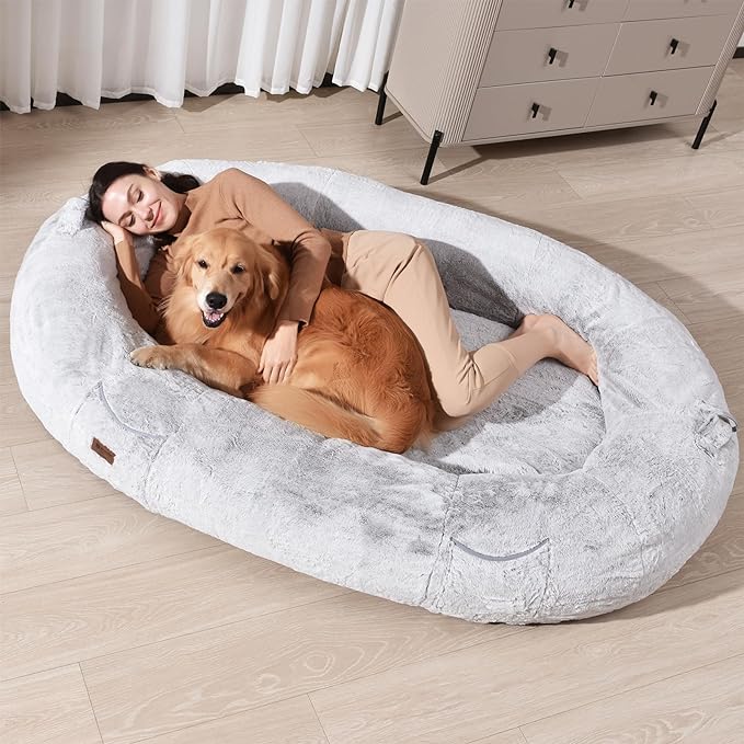 • 【Comfy Plush Fur】Giant Dog bed for humans is crafted from plush faux fur fabric, complementing your stylish home decor. It caters to your aesthetic sense while offering a plush, comfortable feel. Additionally, human size dog bed is equipped with storage pockets for conveniently storing toys, phones, magazines, and more. With two handles designed for easy carrying and storage, this mattress becomes your thoughtful companion in both design and practicality.