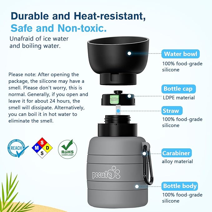• 🐾【Safe and Non-toxic】The collapsible water bowl, straw, and body are all made of 100% food grade silicone, BPA-free, soft, lightweight, tough, and elastic. It is drop-resistant and heat-resistant, suitable for both ice water and boiling water. It is dishwasher safe. (Please note: After unpacking, the silicone may have a smell, please don't worry, this is normal. Generally, the smell will dissipate after opening and placing it for about 24 hours, or you can boil it in hot water to eliminate the smell.)
