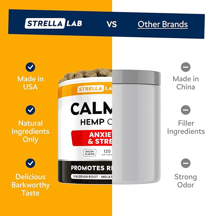• Anti-Stress Support: StrellaLab dog hemp calming chews with melatonin are your ally against canine stress, providing a relaxing treat that supports restful sleep, quiets down excited paws, and helps even the most hyper doggy find their calm.