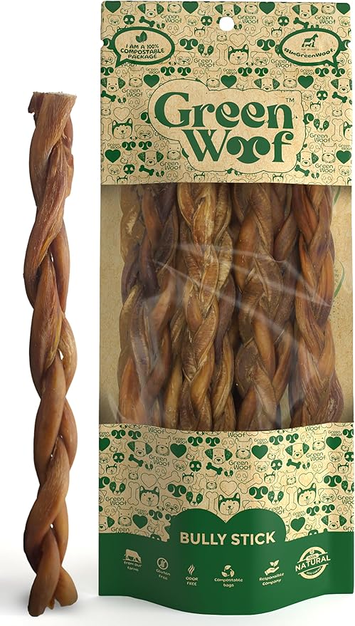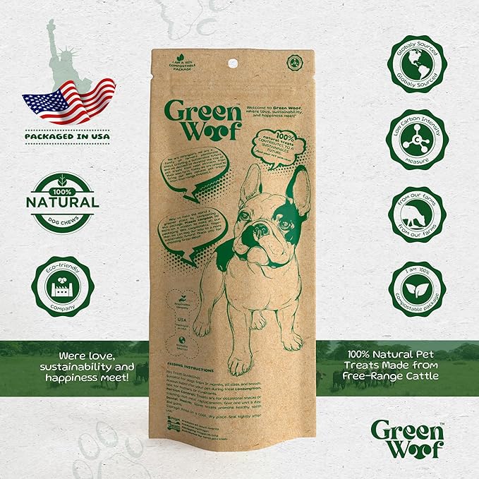 • Eco-Friendly & Sustainably Sourced: Our bully sticks, part of the Green Woof collection, are crafted with the planet's health in mind. Made from 100% natural beef pizzle, these treats are sourced from grass-fed cattle raised on sustainable pastures. This approach ensures a minimal carbon footprint while providing high-quality chews for your pet.