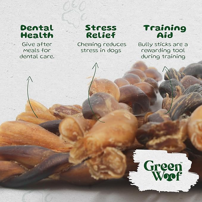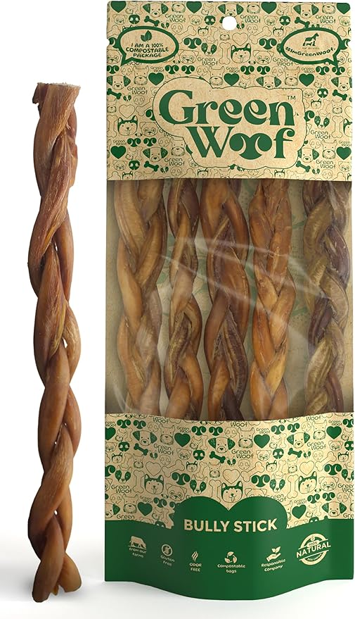 • Eco-Friendly & Sustainably Sourced: Our bully sticks, part of the Green Woof collection, are crafted with the planet's health in mind. Made from 100% natural beef pizzle, these treats are sourced from grass-fed cattle raised on sustainable pastures. This approach ensures a minimal carbon footprint while providing high-quality chews for your pet.