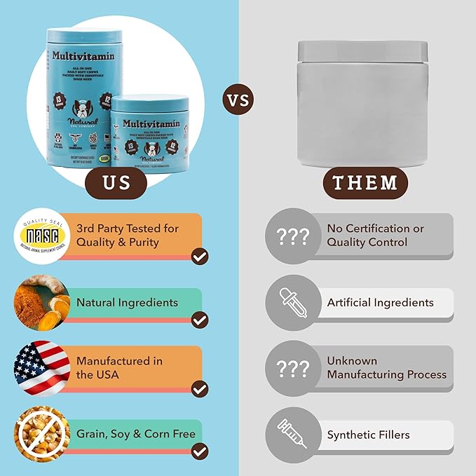 • TRUSTED QUALITY ASSURANCE: Our dog supplements are manufactured in an FDA registered facility and hold the NASC Preferred Supplier certification, ensuring the highest standards of quality and safety. Adhering to cGMP regulations, our multivitamin chews provide reliable nutrition you can trust for your beloved pet.