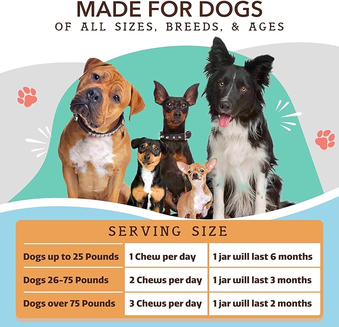 • EASY DOSING GUIDE: For optimal health benefits, give your dog the appropriate amount of our multivitamin for dogs based on their weight. Under 25 lbs: 1 chew per day, 26-75 lbs: 2 chews per day, Over 75 lbs: 3 chews per day.