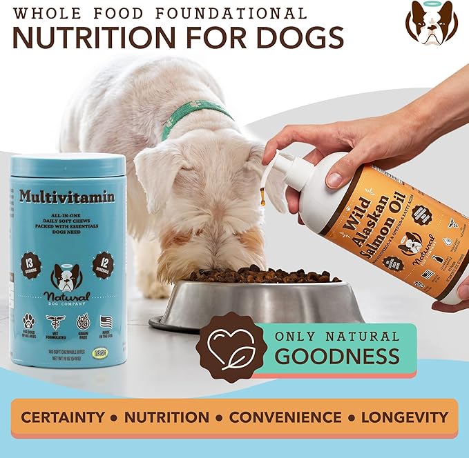• COMPLETE NUTRITION COMBO: Enhance your dog's diet by combining our multivitamin for dogs with our Wild Alaskan Salmon Oil. This dynamic duo delivers a powerful mix of vitamins, minerals, and omega-3s that promote joint flexibility, a shiny coat, and a healthy heart. Give your pet the full spectrum of nutrients they need to thrive every day.