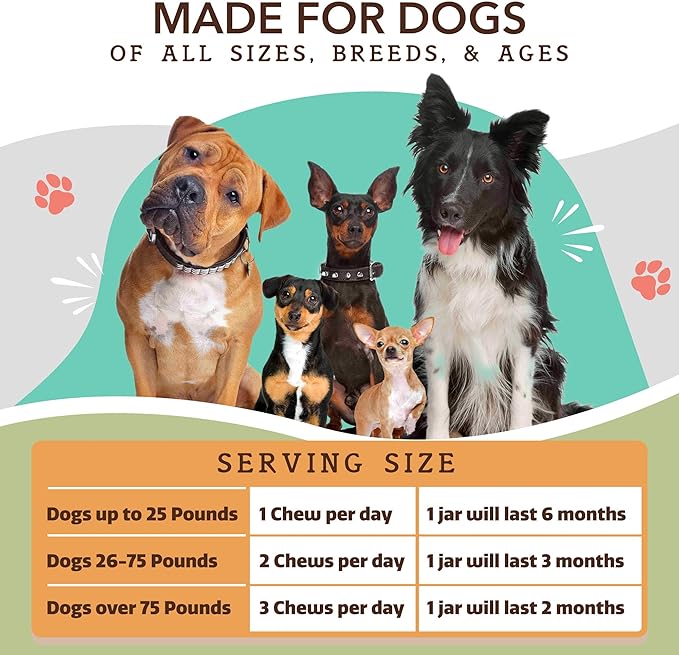 • Product of the USA: Our Dog Glucosamine Chews are safe for dogs of all ages, sizes & breeds. Just 1-3 chews per day (depending on dog's size). Please consult your Vet before giving your dog a new supplement.