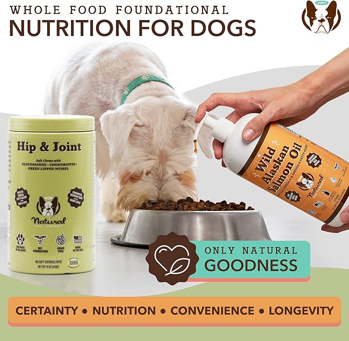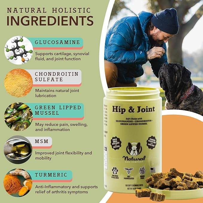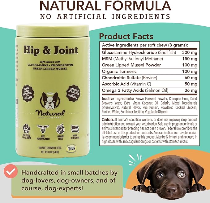 Natural Dog Company Hip & Joint Chews, Chicken Liver & Turmeric Flavor, with Glucosamine Chondroitin for Dogs, Maintains Bone and Joint Health, Supplements for Seniors and Puppies, 180 Count