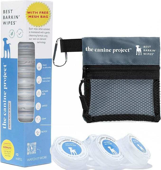 Best BARKIN' Wipes with Free Mesh Bag, Dog Wipes for Paws Ears and Butt, Micellar Aloe Scented Travel Friendly Puppy Wipes (12-Pack)
