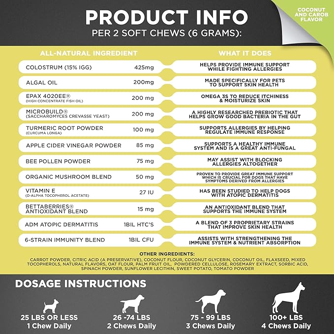• NEW AND IMPROVED FORMULA: Our new formula Allergy & Immune support chews with omega 3 for dogs provides allergy relief for dogs itching and support a natural histamine response. Meaning less itching, sneezing, and scratching for your pup.