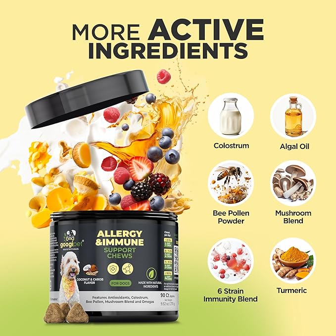 Googipet Dog Allergy Chews -Dog Allergy Relief & Itchy Skin Relief -Dog Skin & Coat Supplement +Bee Pollen, Colostrum for Dogs, Coconut Oil, Probiotics, & Omega 3 Fish Oil for Dogs Itching Skin Relief