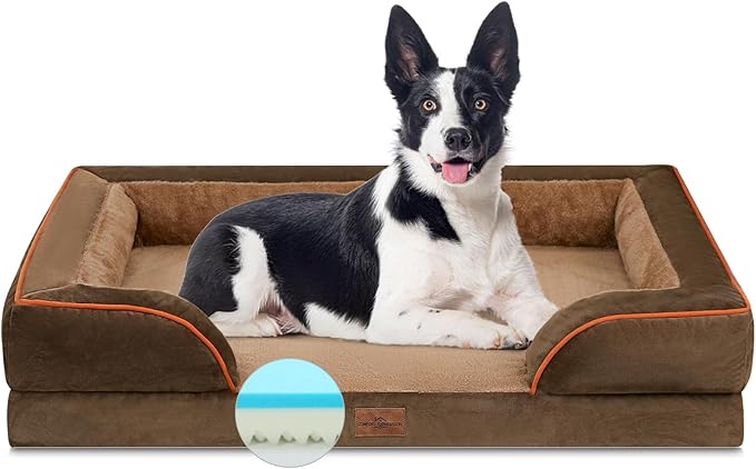 Cooling Dog Bed Orthopedic, Memory Foam Dog Bed for Large Dogs, Waterproof Dog Beds, Washable Dog Bed with Removable Cover,Pet Bed Dog Sofa with Bolster(Large,Khaki Brown)