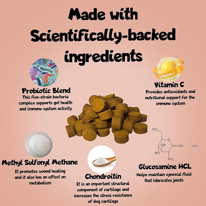 • 🧬Joint Health Support: Our multivitamin supplement contains glucosamine HCL, methyl sulfonyl methane, and chondroitin, which work together to promote healthy joints, reduce inflammation, and improve flexibility, ensuring your furry friend stays active and mobile.