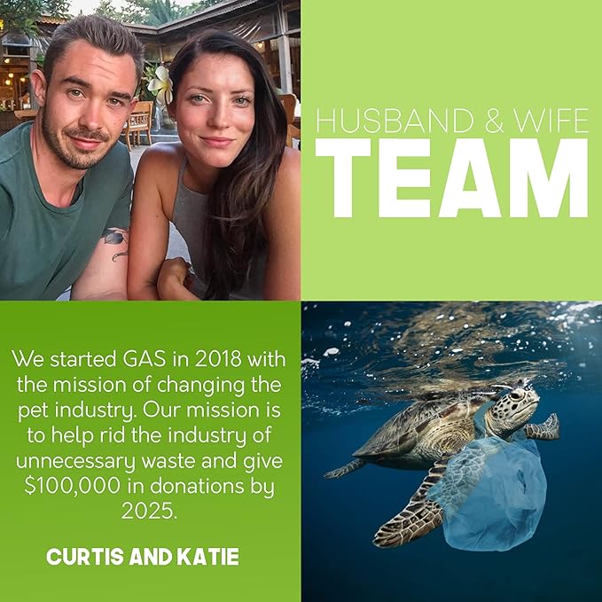 • 👫 SMALL BUSINESS WITH A BIG HEART: Founded in 2018 by Curtis and Katie, a dynamic husband and wife duo, G.A.S is not just our business - it's our passion. Dedicated to revolutionizing the pet industry, our small team is big on making a positive impact on the planet and helping animals in need. It's our mission to rescue 100,000 animals before the end of 2026.