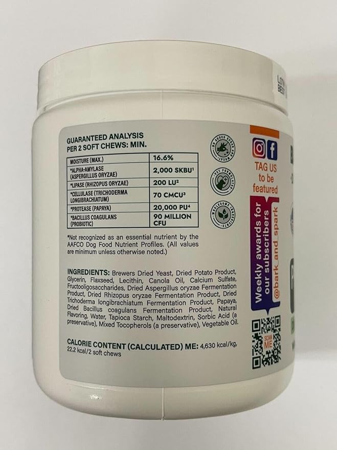 • Bark&Spark Commitment - we are keen to give best to our furry customers and we take no compromise when it comes to product quality. So these digestion bites are made in the USA, with sustainably sourced, human grade ingredient. Treats are suitable for small and large pets of all breeds and ages, from puppies to senior dogs.