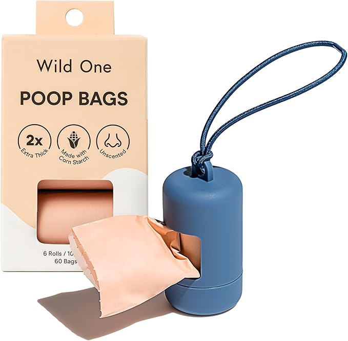 Wild One Dog Poop Bag Holder and Dispenser with Leash Attachment, Leak Proof, Easy Twist Top for Refills, Includes 1 Box Poop Bags, Navy
