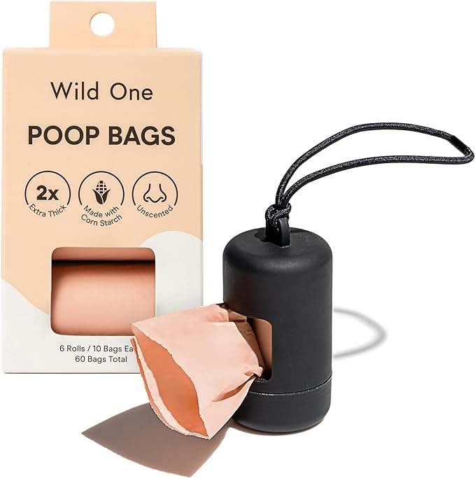 Wild One Dog Poop Bag Holder and Dispenser with Leash Attachment, Leak Proof, Easy Twist Top for Refills, Includes 1 Box Poop Bags, Black