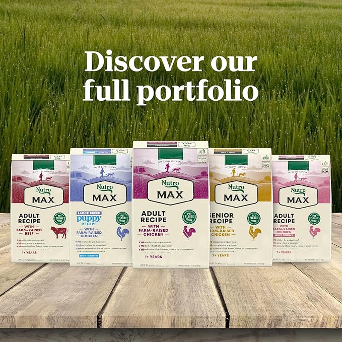 • Quality Recipe: Nutro Max Adult Large Breed Dry Dog Food with Farm-Raised Chicken is made with no chicken by-product meal, corn, wheat, or soy protein, although trace amounts may be present due to potential cross-contact during manufacturing.