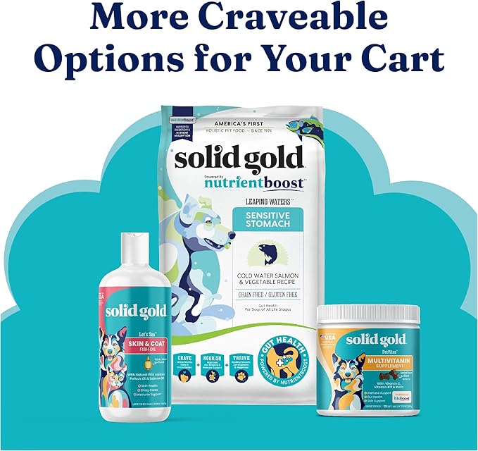 • Make Your Dog Leap for Something Fab! - Solid Gold Fit and Fabulous weight control dog food and Leaping Waters sensitive stomach dog food are grain free dog foods that supports gut, immune, skin, and coat health for any adult breed